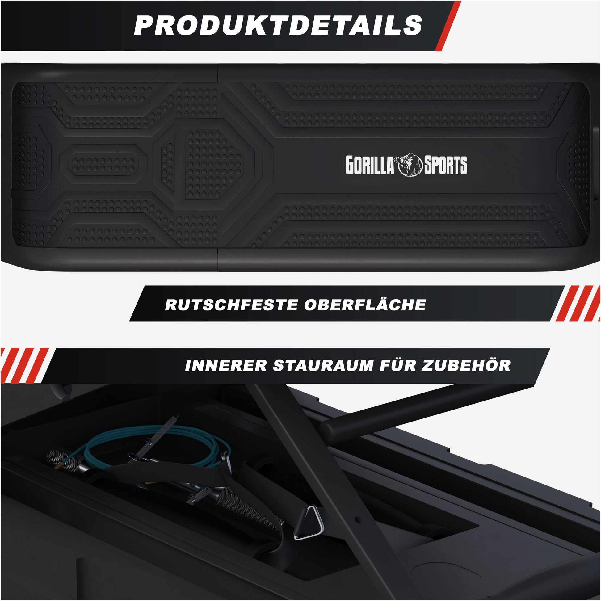 Das GORILLA SPORTS® Aerobic Deck ist mehr als nur ein einfacher Stepper. Es gibt Dir die Freiheit, Dein Training genau nach Deinen Vorstellungen zu gestalten – ob Cardio, Krafttraining oder Stretching. Dank der robusten Konstruktion und der rutschfesten Oberfläche trainierst Du sicher, auch wenn Du an Deine Grenzen gehst. Nach dem Workout kannst Du Dein Zubehör bequem im integrierten Staufach verstauen, damit Dein Home Gym immer ordentlich bleibt. Setze auf ein vielseitiges Trainingsgerät, das Deine Fitnessroutine bereichert und Dir bei jedem Schritt Stabilität und Komfort bietet!
