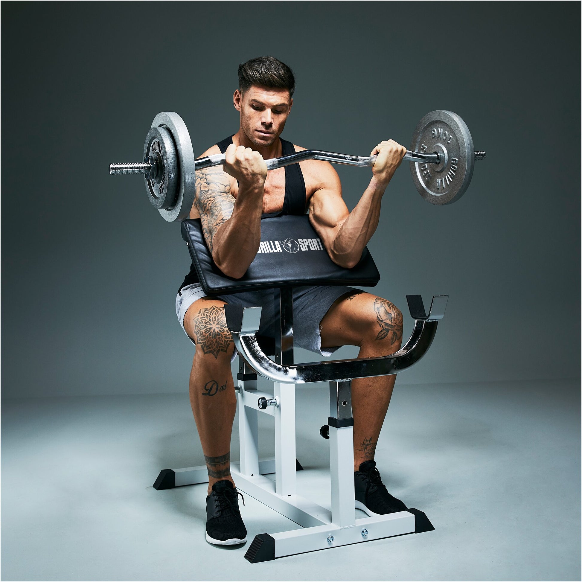 Die Curlbank Bizeps-120 cm-SZ-Curlstange von Gorilla Sports mit den gusseisernen Gewichten ist das ideale Zubehör zur Curlbank. Sie eignet sich für Isolationsübungen zur Kräftigung von Bizeps als auch Trizeps. Dabei erfordert sie eine Handstellung, die gleichzeitig Deine Handgelenke entlastet.