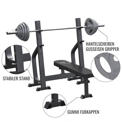 Für Bankdrücken im Home-Gym: Drückerbank massiv inkl. Olympia Langhantelset Gusseisen Gripper 130 kg