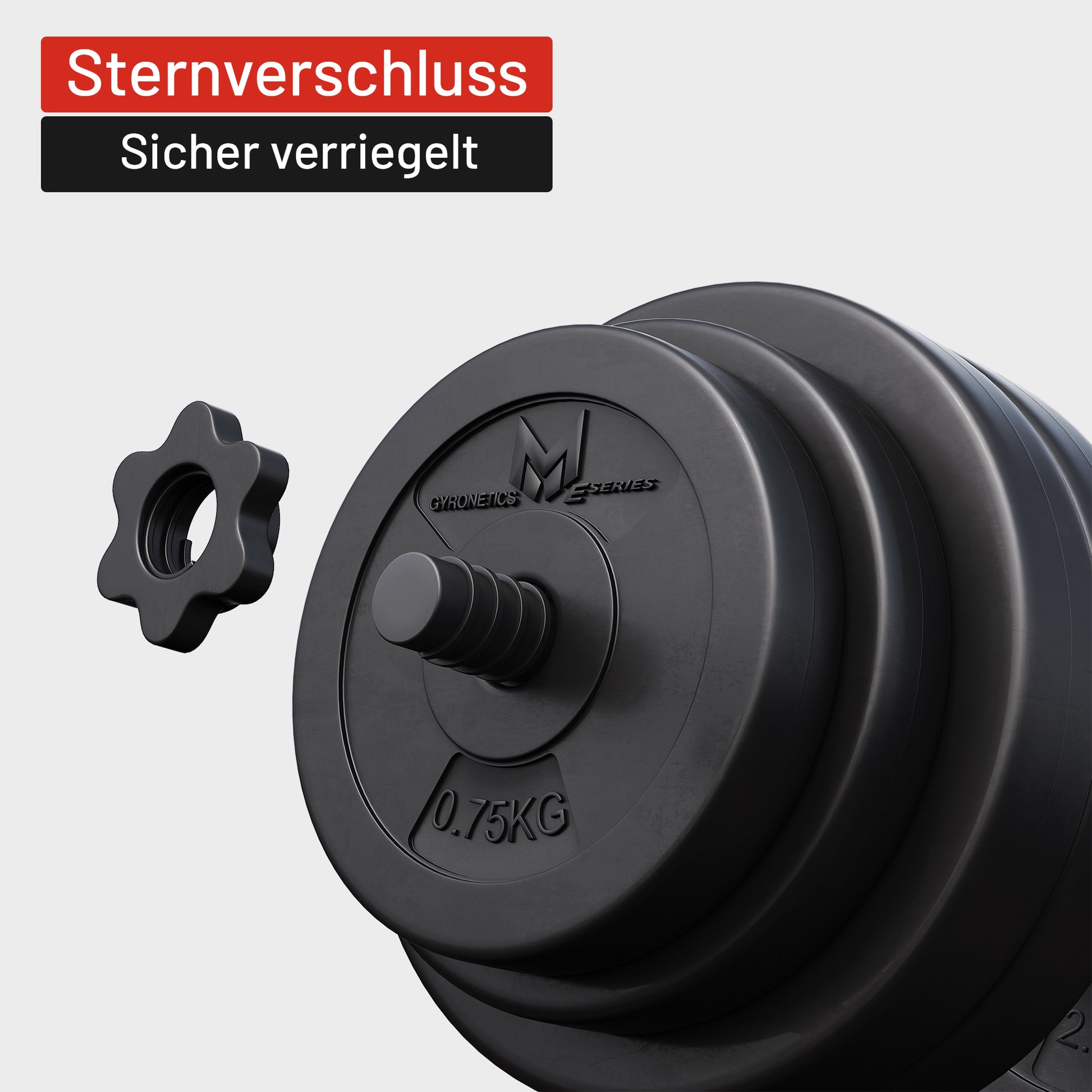 Gyronetics E-Series Kurzhantel Set 25 mm Kunststoff 30 kg – variantenreiches Krafttraining für dein Home Gym. Das E-Series Kurzhantelset bietet mit 2 Kurzhantelstangen (je 46 cm, 25 mm Durchmesser) und 16 Hantelscheiben eine solide Basis für effektives Muskelaufbau-Training. Die 16 Scheiben umfassen 8x 2,5 kg, 4x 1,25 kg und 4x 0,75 kg – damit stellst du das Gewicht flexibel bis maximal 20 kg pro Stange ein. Die Kunststoffummantelung schont deinen Boden, während die gerändelten Griffe auch bei intensiven Trainingseinheiten sicheren Halt bieten. Mit den 4 Sternverschlüssen fixierst du die Scheiben zuverlässig.