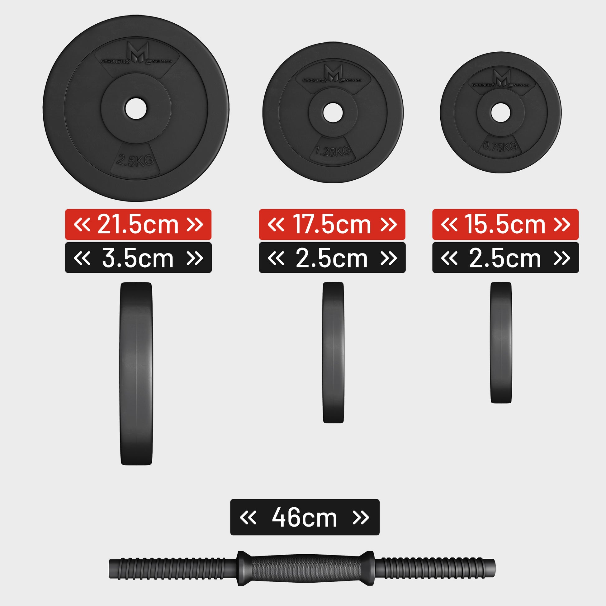 - Set mit 2 Kurzhantelstangen und 16 Scheiben (0,75-5 kg)