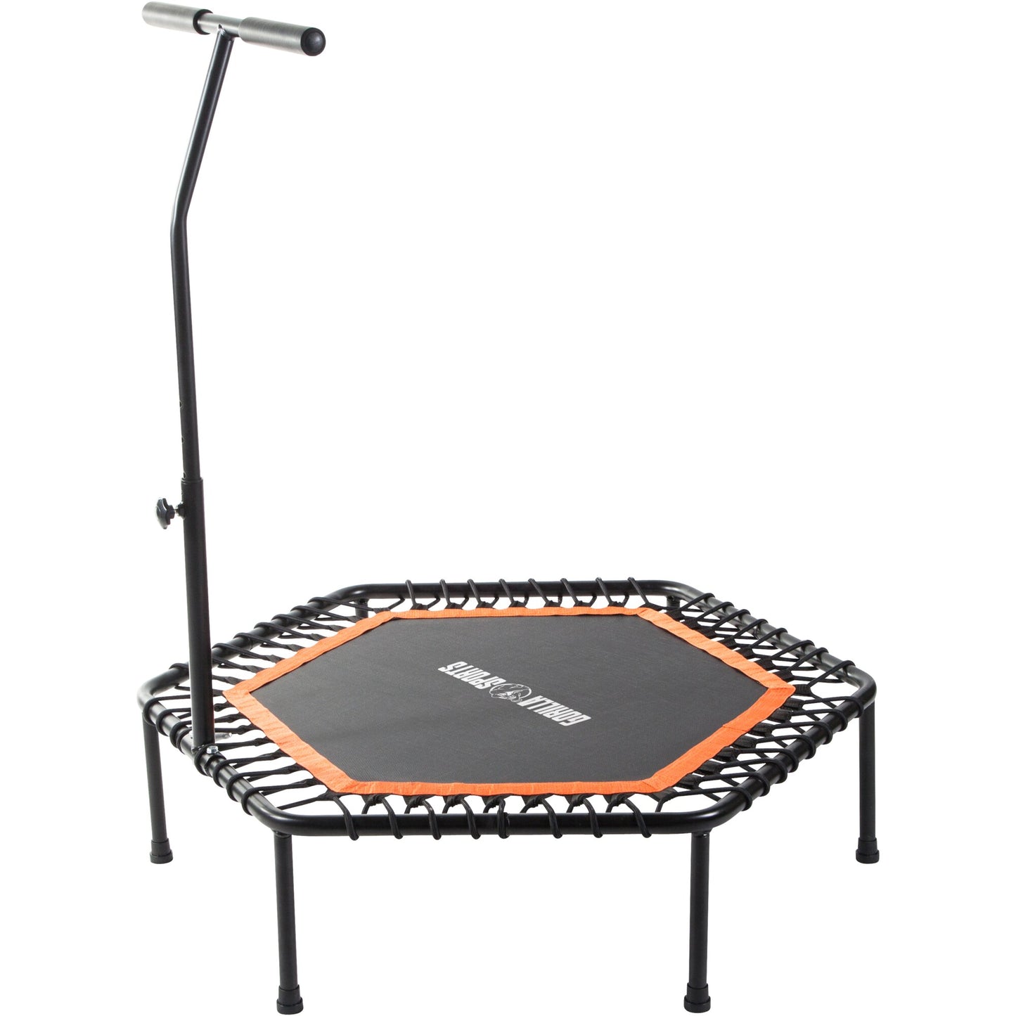 Fit & Fun in einem Gerät. Das standsichere Gorilla Sports Fitness-Trampolin steht in Deinem Home-Gym für flexible Trainingseinheiten bereit, ganz ohne Anfahrtszeiten. Seine Gummiseilfederung ermöglicht ein geräuscharmes Training. Seine sechsfach höhenverstellbare Haltestange mit Griff stellst Du komfortabel auf Deine Körpergröße ein. Es eignet sich als moderates Ausdauertraining für Anfänger ebenso wie für rasantes Jumping, mit dem Du reichlich Kalorien verbrennst.
