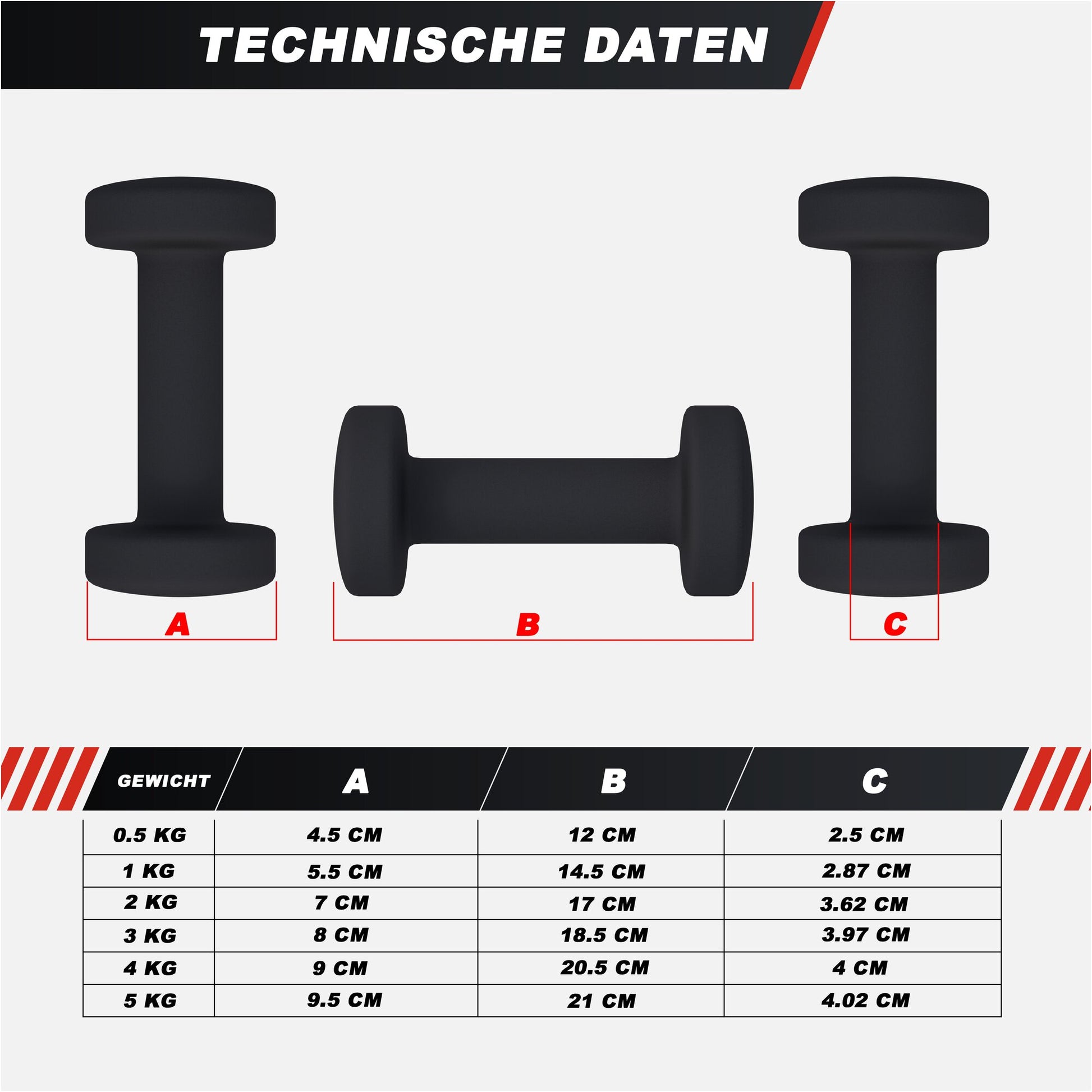 Dank des hervorragenden Preis-Leistungs-Verhältnisses ist es ideal, sich die Hanteln in zwei oder sogar drei Gewichtsklassen zuzulegen, um immer die optimale Belastung wählen zu können.