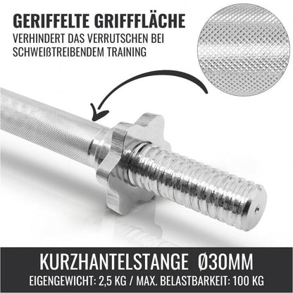 - Kurzhantelstangen aus Chrom mit Griff-Rändelung und Gewinde