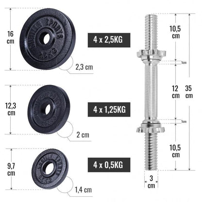 Außerdem gehören zum Lieferumfang vier Sternverschlüsse und 12 Hantelscheiben mit Standardlochdurchmesser 30/31 mm aus solidem Gusseisen mit einem Gesamtgewicht von 17 kg: