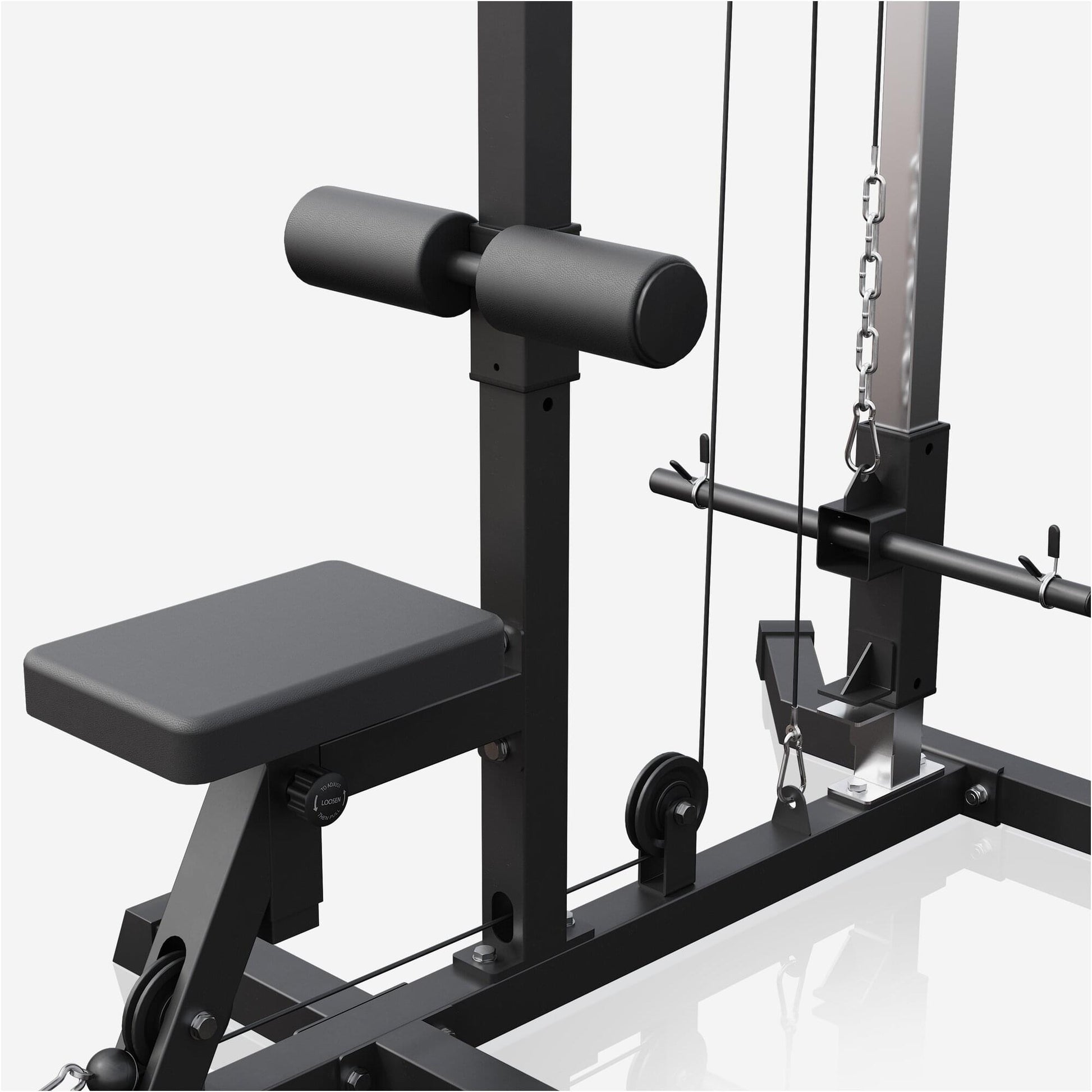 Außer klassischen Latzügen zum Nacken kannst Du mit dieser Latzugstation auch Latzüge zur Brust oder Cable Crunches ausführen. Mit diesen Übungen sprichst Du Teile des Rückens verstärkt an, die der normale Latzug nicht erreicht. Noch mehr Übungen gefällig? Dann lass das Seil durch die untere Führung laufen. Im Handumdrehen hast Du zusätzliche Möglichkeiten, zum Beispiel Bizepscurls und stehendes Rudern. Und das ist noch nicht alles. Weitere Optionen sind French Press und Trizepsdrücken - um nur zwei zu nennen!