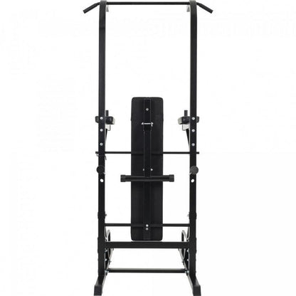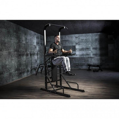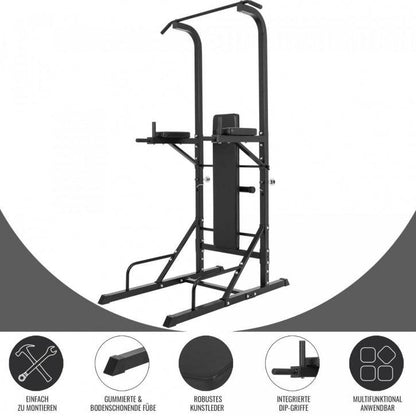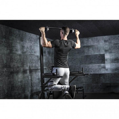- Inklusive einer 107 cm breite Klimmzugstange, Dipgriffe mit einem Bodenabstand von 120 cm sowie Armpolster von 33 x 15 cm