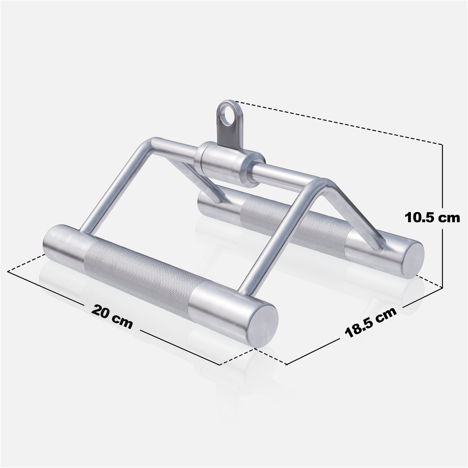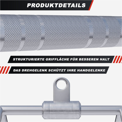 Der parallele, enge Rudergriff ist innen hohl. Dadurch, dass der Griff nicht aus Vollmaterial besteht, ist er besonders leicht und damit auch leicht aufzuhängen und anzubringen, selbst wenn der Haken in großer Höhe schwebt. Der verchromte Rudergriff weist eine gut spürbare Griffrändelung auf und ist damit besonders gut zu greifen. Selbst mit schweißnassen Händen oder stark in Mitleidenschaft gezogenen Handschuhen hast Du hier immer die volle Kontrolle. So muss Studioqualität für Heimfitness aussehen!