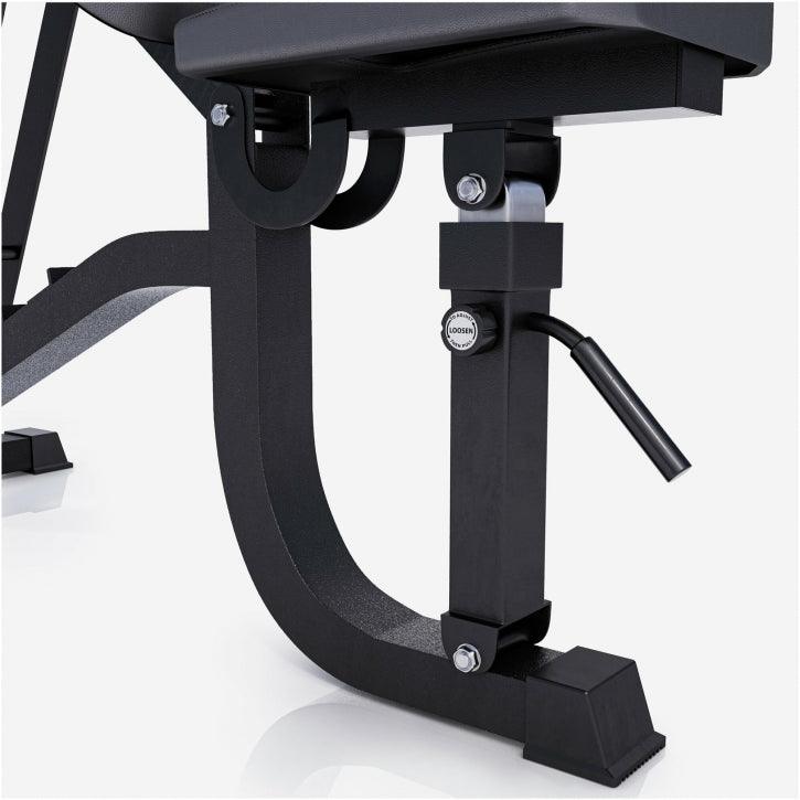 Modernes Design vereint sich hier mit hoher Stabilität – und das alles, um Dir das Training Deines Lebens zu geben. Die Rückenlehne lässt sich in 7 verschiedenen Winkeln einstellen, die Sitzfläche ist in 5 Höhenstufen verstellbar. Damit weist die Bandbreite möglicher durchführbarer Übungen eine ganz neue Dimension auf. Der massive Stahlrahmen und die gummierten Füße sorgen für perfekte Stabilität, selbst bei intensivsten Übungen. Die Polster aus Kunstleder fühlen sich auch beim Liegen angenehm an und unterstützen Dich bei Übungen wie der bench press durch das Komfortgefühl.