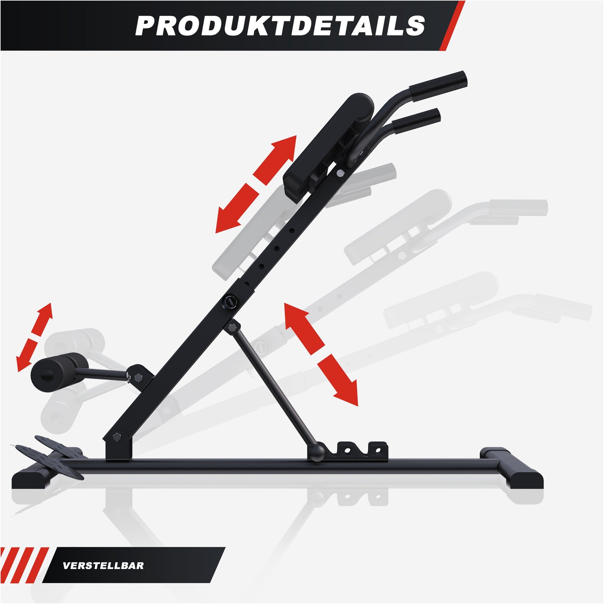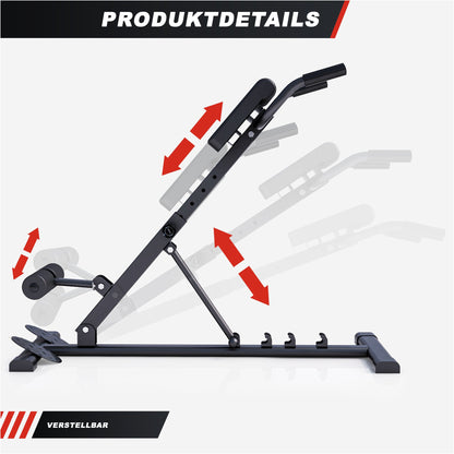 Stärke Deinen Rücken und verbessere Deine Fitness mit der GORILLA SPORTS® Hyperextension Bank! Dieses innovative Fitnessgerät vereint Funktionalität, Komfort und Sicherheit, damit Du Dein Training zu Hause noch effektiver gestalten kannst. Mit sechs Einstellmöglichkeiten für die Polsterung und drei Neigungswinkeln (40°, 45°, 50°) passt sich die Bank optimal Deinen Bedürfnissen an. Ob Rückentraining, Sit-ups oder Übungen mit Hanteln – dieses Gerät bietet alles, was Du für ein vielseitiges Workout brauchst.