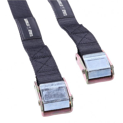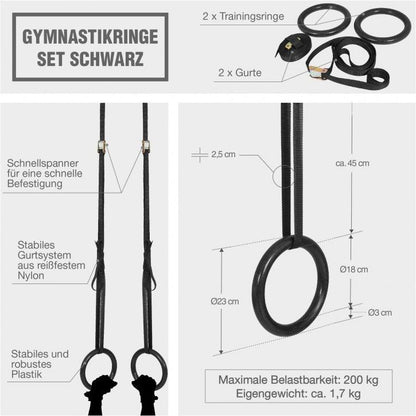 Bei den Turnringen handelt es sich um Ringe mit 23 Zentimetern Durchmesser. Zwei stabile Gurte mit Schnellspannern dienen Dir als Aufhängung und lassen sich so leicht montieren, dass Du sofort loslegen kannst. Die Gürtel sind absolut reißfest und halten bis zu 200 Kilogramm aus; erlauben also eine riesige Bandbreite an Übungen.